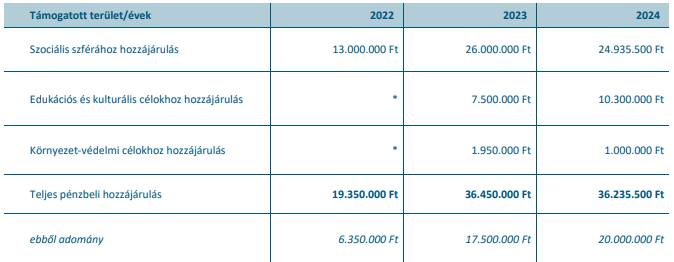 2024-ben a közösségnek nyújtott teljes pénzbeli hozzájárulás 36.235.500 Ft volt (2023: 36.450.000 Ft).